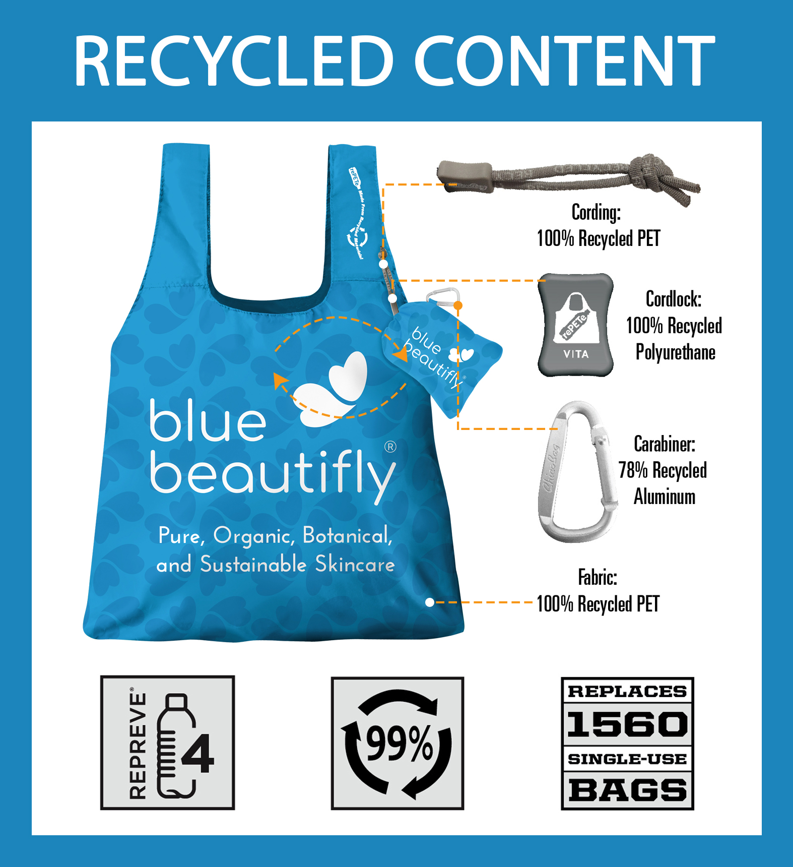 The fabric is made with certified Repreve material which is 100% post-consumer recycled plastic bottles. In addition, the carabiner, cording, and cord lock are also made of recycled.